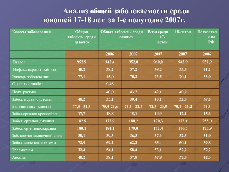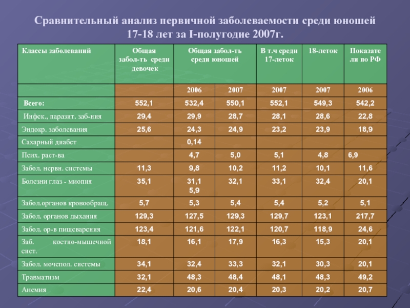 Слайд 5Сравнительный анализ первичной заболеваемости среди юношей 17-18 лет за I-полугодие 2007г.