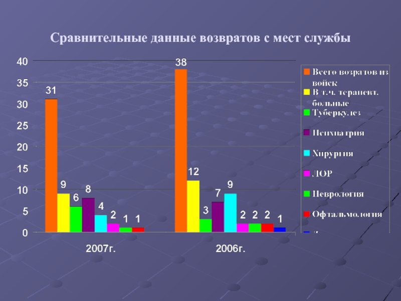 Слайд 8Возвраты призывников с РСП состоянию здоровья в период весеннего призыва 2007г.