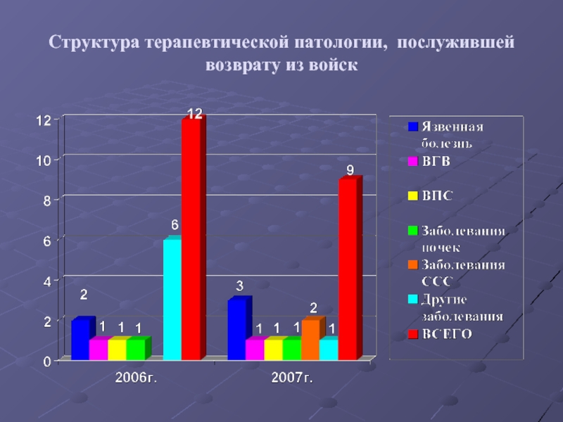 Слайд 13Структура терапевтической патологии, послужившей возврату из войск