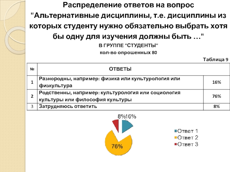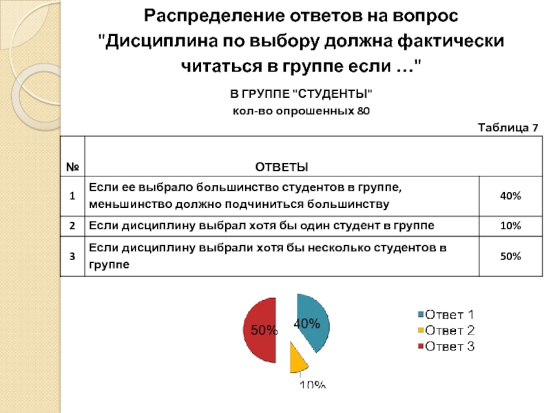 Распределение ответов на вопрос Охарактеризуйте свой интерес к учёбе в группе студенты кол-во опрошенных 795 Таблица 1 ОТВЕТЫ 1Учусь с интересом, учёба. презентация