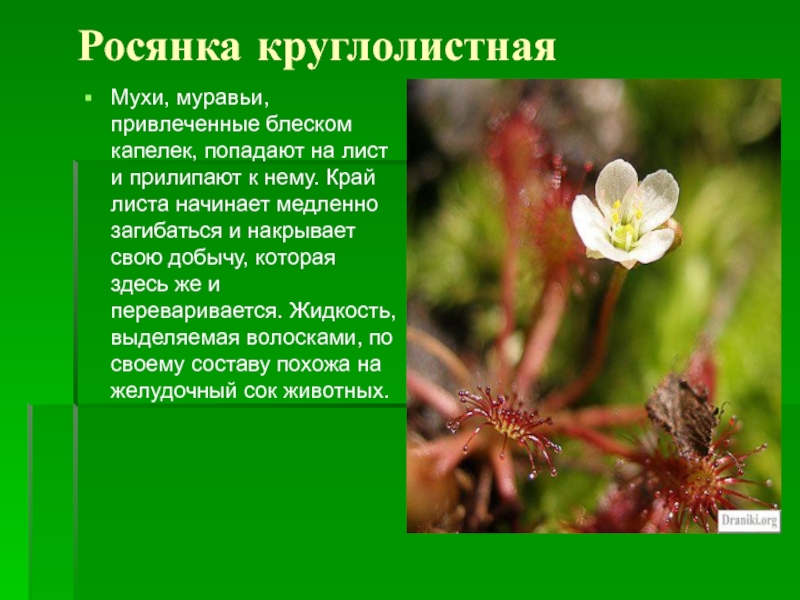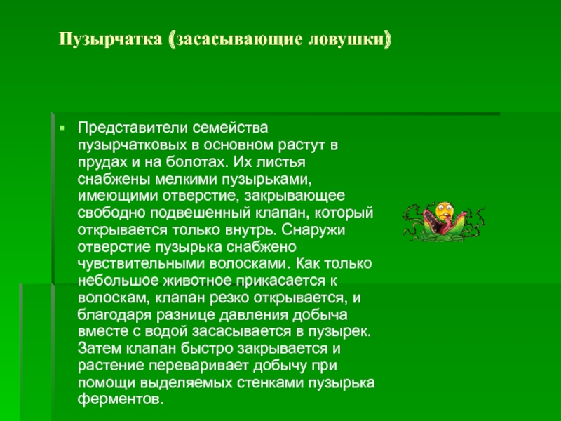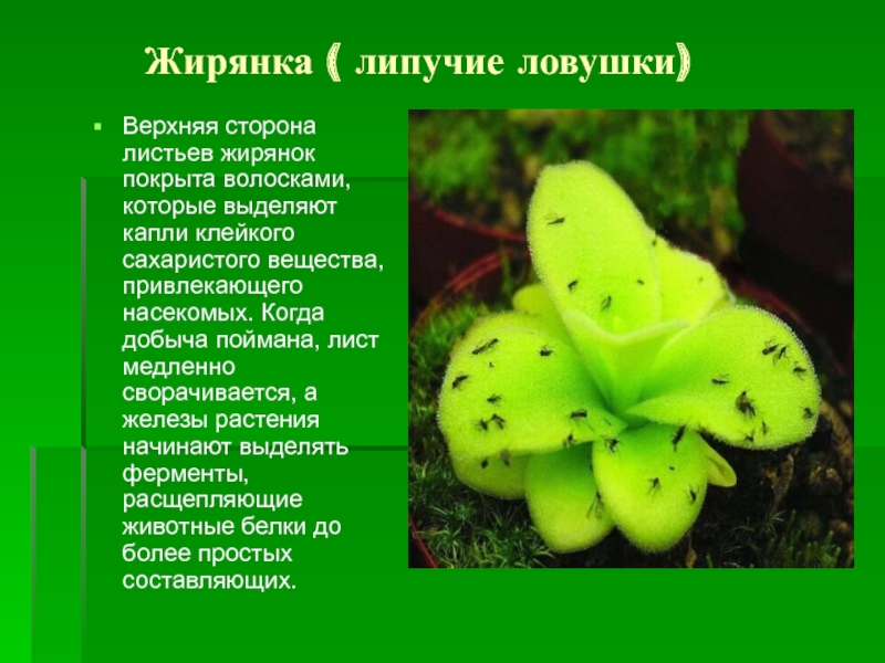 Листья растений, использующих метод «охоты», похожи на миниатюрный капкан. Ярким представителем подобных растений является венерина мухоловка. Ее листья с зазубренными краями состоят из двух половинок, снабженных чувствительными волосками, реагирующими на прикосновения. Расположенные по краям ловушки железы выделяют нектар, привлекающий насекомых. Если жертва касается чувствительных волосков, половинки листа захлопываются, а зубцы заходят друг за друга, мешая ей выбраться наружу.