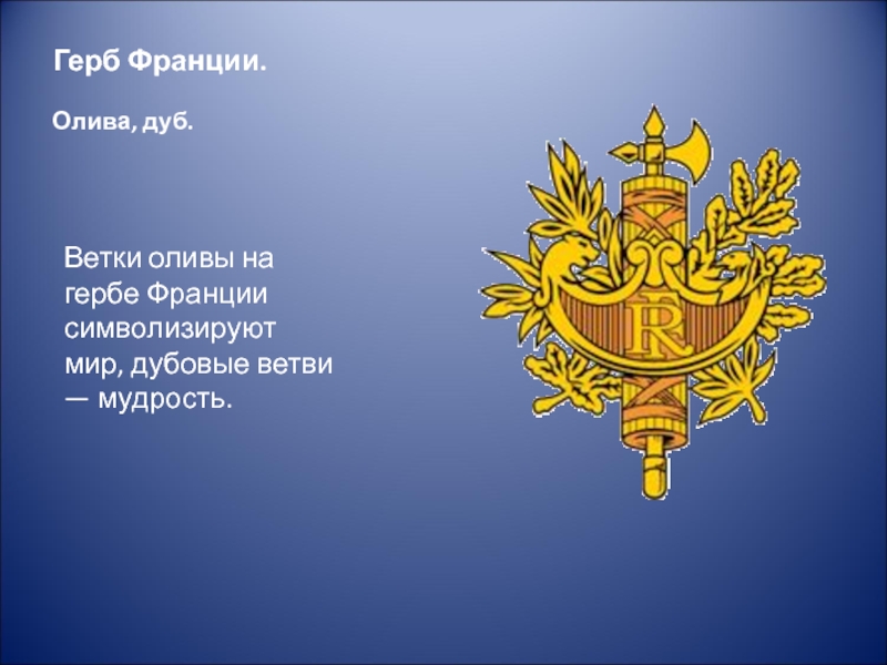Ветки оливы на гербе Франции символизируют мир, дубовые ветви
