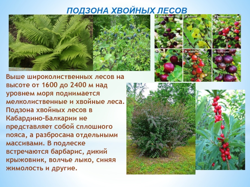Выше широколиственных лесов на высоте от 1600 до 2400 м над уровнем моря поднимается мелколиственные и хвойные леса. Подзона хвойных лесов в Кабардино-Балкарии не представляет собой сплошного пояса, а разбросана отдельными массивами. В подлеске встречаются барбарис, дикий крыжовник, волчье лыко, синяя жимолость и другие.
