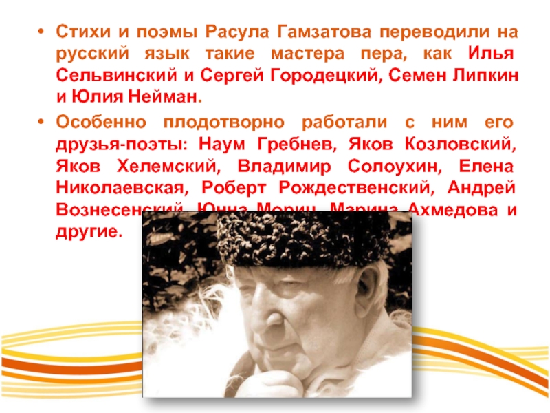 Слайд 8Стихи и поэмы Расула Гамзатова переводили на русский язык такие мастера