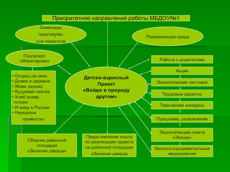 Подготовка и проведение постоянно действующего семинара-практикума «Проектный метод» Работа по пополнению экспонатами «Мини-музеев» и участие в детско-взрослых проектах по группам .