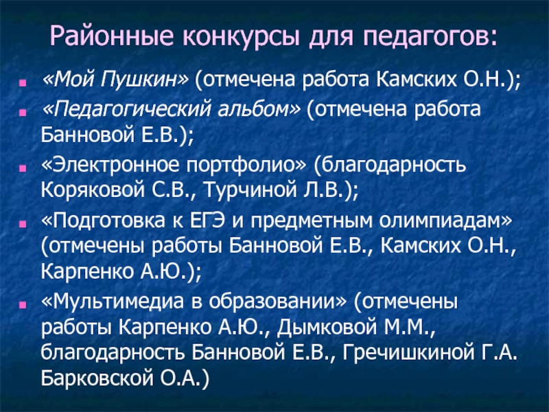 «Мультимедиа в образовании» (отмечены работы Карпенко А.Ю., Дымковой М.М., благодарность Банновой Е.В., Гречишкиной Г.А. Барковской О.А.)
