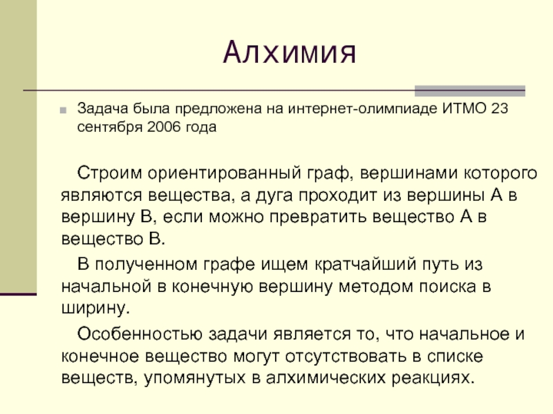 Особенностью задачи является то, что начальное и конечное вещество могут отсутствовать в списке веществ, упомянутых в алхимических реакциях.