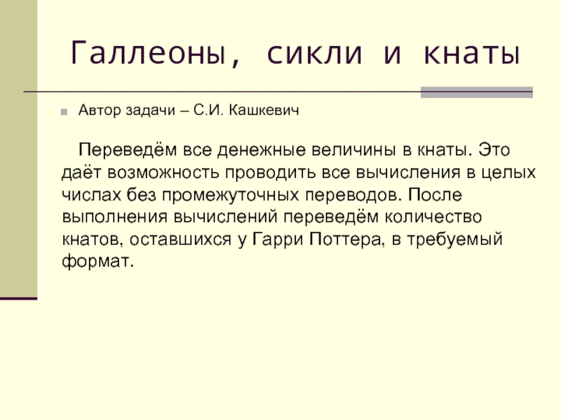 в кнаты. Это даёт возможность проводить все вычисления в целых числах без промежуточных переводов. После выполнения вычислений переведём количество кнатов, оставшихся у Гарри Поттера, в требуемый формат.
