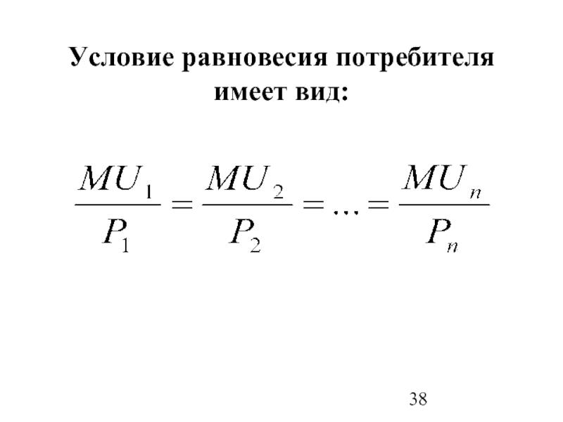 Слайд 38Условие равновесия потребителя имеет вид: