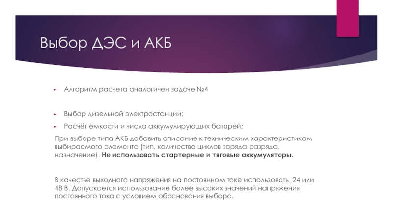 При выборе типа АКБ добавить описание к техническим характеристикам выбираемого элемента (тип, количество циклов заряда-разряда, назначение). Не использовать стартерные и тяговые аккумуляторы.