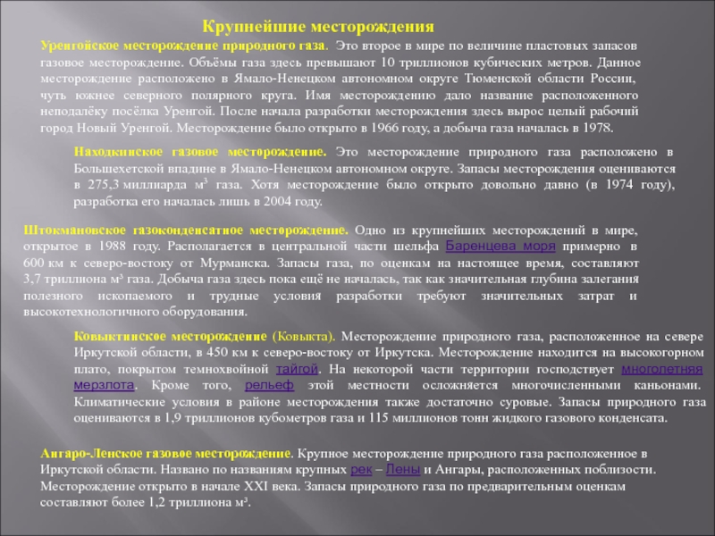 Ковыктинское месторождение (Ковыкта). Месторождение природного газа, расположенное на севере Иркутской области, в 450 км к северо-востоку от Иркутска. Месторождение находится на высокогорном плато, покрытом темнохвойной тайгой. На некоторой части территории господствует многолетняя мерзлота. Кроме того, рельеф этой местности осложняется многочисленными каньонами. Климатические условия в районе месторождения также достаточно суровые. Запасы природного газа оцениваются в 1,9 триллионов кубометров газа и 115 миллионов тонн жидкого газового конденсата.