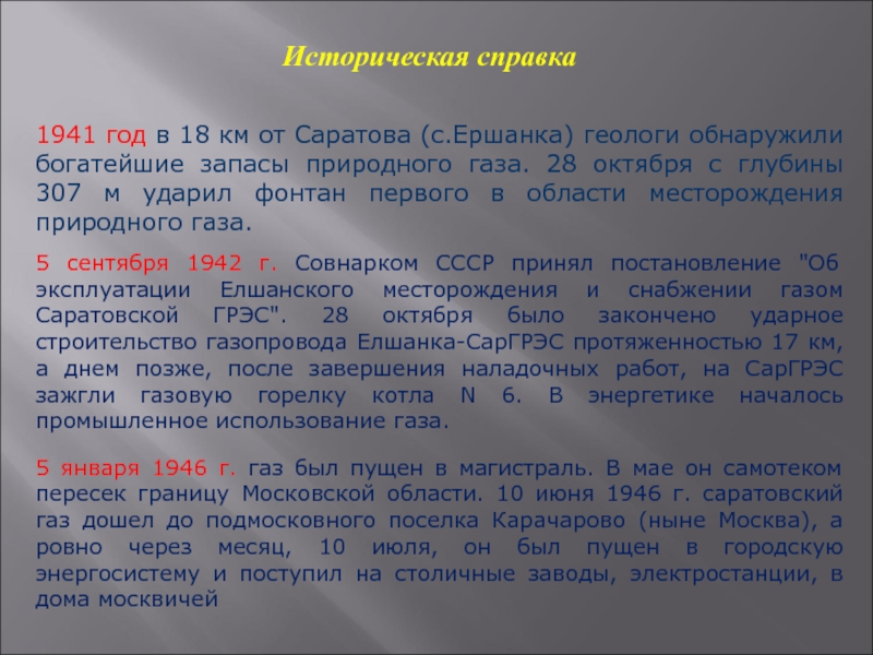 5 сентября 1942 г. Совнарком СССР принял постановление "Об эксплуатации Елшанского месторождения и снабжении газом Саратовской ГРЭС". 28 октября было закончено ударное строительство газопровода Елшанка-СарГРЭС протяженностью 17 км, а днем позже, после завершения наладочных работ, на СарГРЭС зажгли газовую горелку котла N 6. В энергетике началось промышленное использование газа.