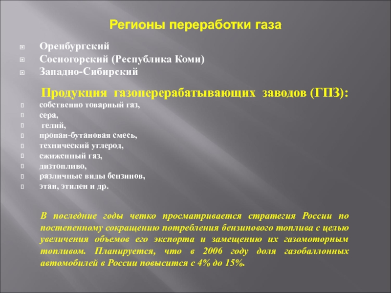 В последние годы четко просматривается стратегия России по постепенному сокращению потребления бензинового топлива с целью увеличения объемов его экспорта и замещению их газомоторным топливом. Планируется, что в 2006 году доля газобаллонных автомобилей в России повысится с 4% до 15%.