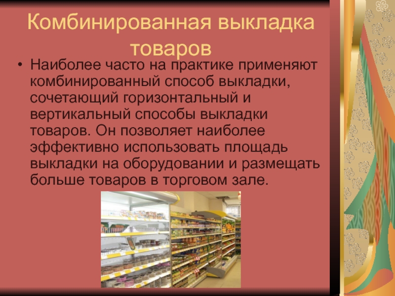 горизонтальный и вертикальный способы выкладки товаров. Он позволяет наиболее эффективно использовать площадь выкладки на оборудовании и размещать больше товаров в торговом зале.