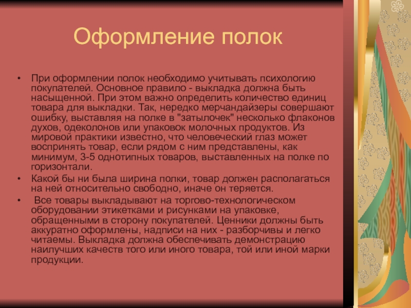 При оформлении полок необходимо учитывать психологию покупателей. Основное правило -