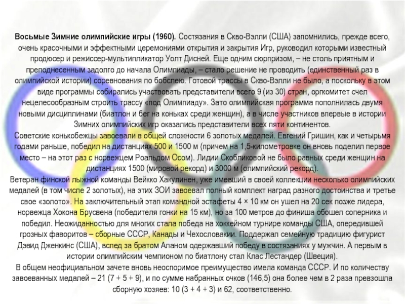 Слайд 12Восьмые Зимние олимпийские игры (1960). Состязания в Скво-Вэлли (США) запомнились, прежде