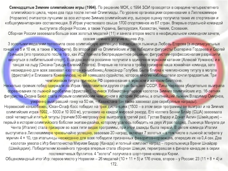 Слайд 21Семнадцатые Зимние олимпийские игры (1994). По решению МОК, с 1994 ЗОИ