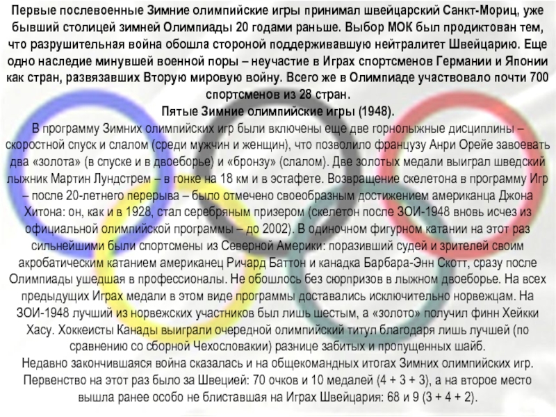 зимней Олимпиады 20 годами раньше. Выбор МОК был продиктован тем, что разрушительная война обошла стороной поддерживавшую нейтралитет Швейцарию. Еще одно наследие минувшей военной поры – неучастие в Играх спортсменов Германии и Японии как стран, развязавших Вторую мировую войну. Всего же в Олимпиаде участвовало почти 700 спортсменов из 28 стран.