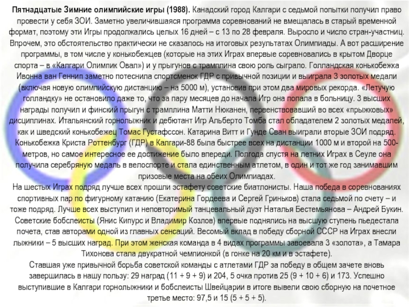 Слайд 19Пятнадцатые Зимние олимпийские игры (1988). Канадский город Калгари с седьмой попытки