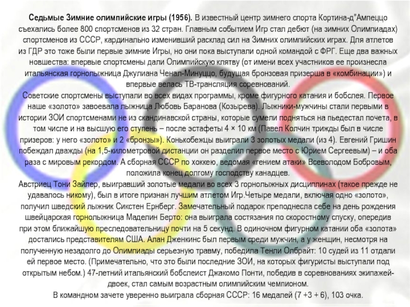 Слайд 11Седьмые Зимние олимпийские игры (1956). В известный центр зимнего спорта Кортина-д"Ампеццо