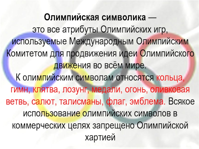 К олимпийским символам относятся кольца, гимн, клятва, лозунг, медали, огонь, оливковая ветвь, салют, талисманы, флаг, эмблема. Всякое использование олимпийских символов в коммерческих целях запрещено Олимпийской хартией