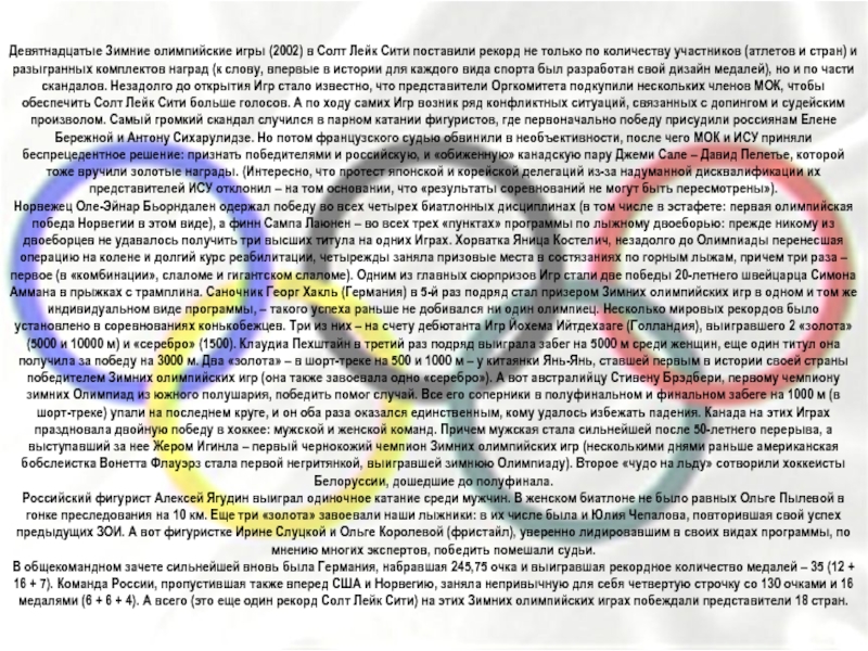 Слайд 23Девятнадцатые Зимние олимпийские игры (2002) в Солт Лейк Сити поставили рекорд