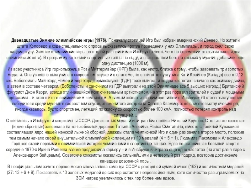 Слайд 16Двенадцатые Зимние олимпийские игры (1976). Поначалу столицей Игр был избран американский
