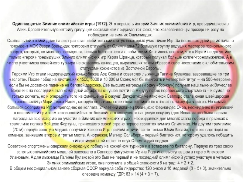 Слайд 15Одиннадцатые Зимние олимпийские игры (1972). Это первые в истории Зимних олимпийских