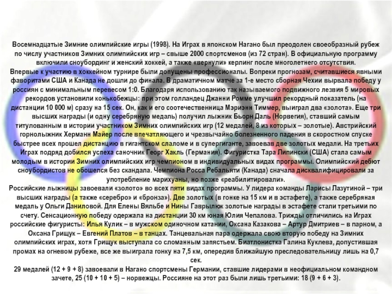 Слайд 22Восемнадцатые Зимние олимпийские игры (1998). На Играх в японском Нагано был