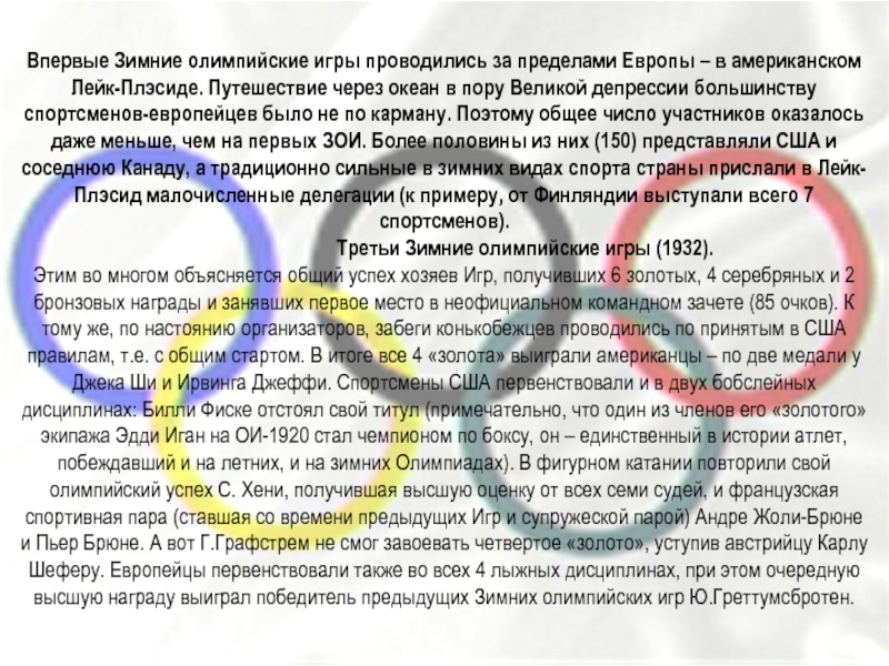 Слайд 8Впервые Зимние олимпийские игры проводились за пределами Европы – в американском