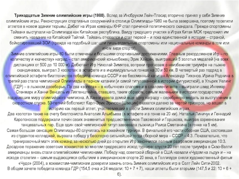 Слайд 17Тринадцатые Зимние олимпийские игры (1980). Вслед за Инсбруком Лейк-Плэсид вторично принял