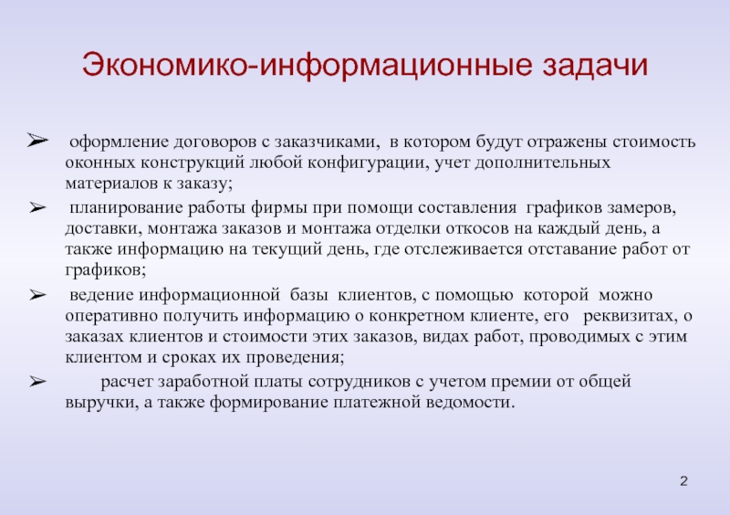 ведение информационной базы клиентов, с помощью которой можно оперативно получить информацию о конкретном клиенте, его реквизитах, о заказах клиентов и стоимости этих заказов, видах работ, проводимых с этим клиентом и сроках их проведения;