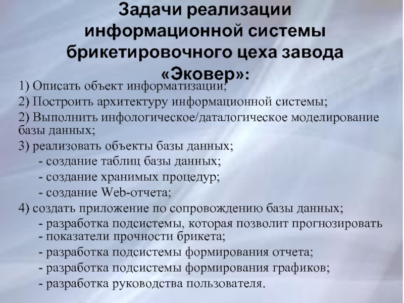 Слайд 3Задачи реализации информационной системы брикетировочного цеха завода «Эковер»: