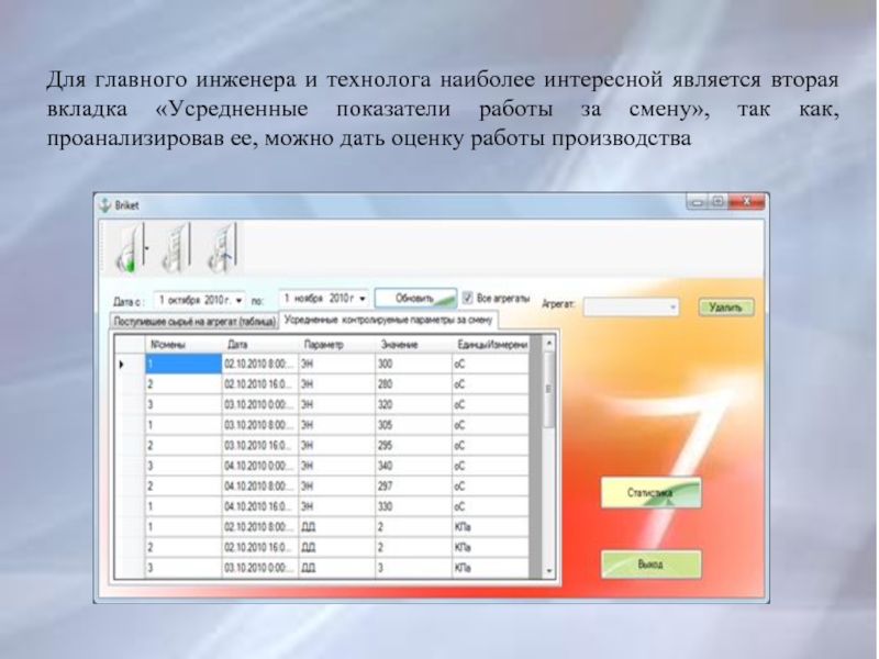 Слайд 12Для главного инженера и технолога наиболее интересной является вторая вкладка «Усредненные