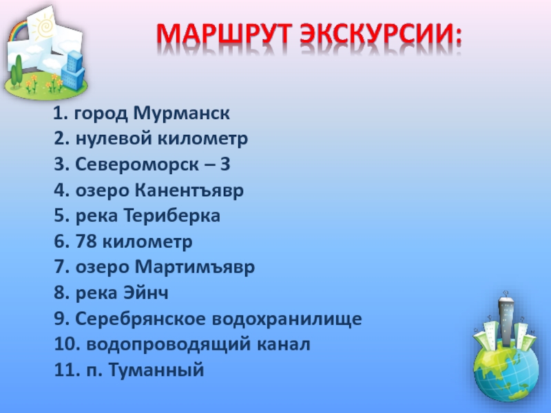 Слайд 3МАРШРУТ ЭКСКУРСИИ: