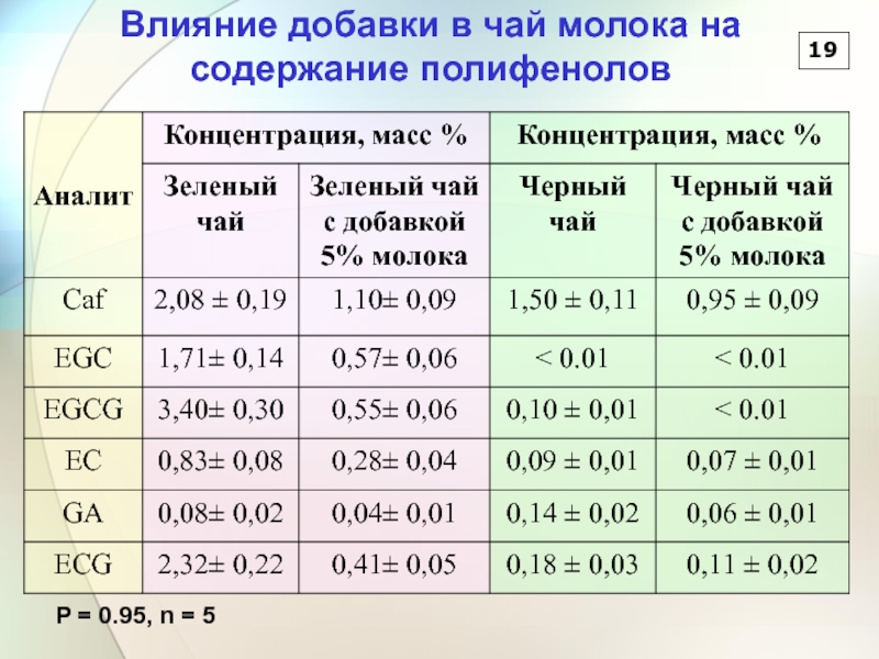 4. Показано, что процессы комплексообразования полифенолов чая с казеином и ионами Fe3+ приводит к заметному снижению содержания полифенольных соединений.
