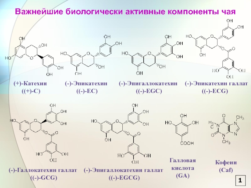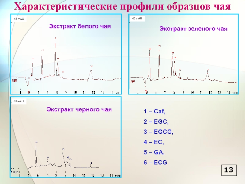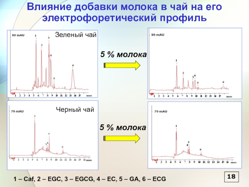 1 – Caf, 2 – EGC, 3 – EGCG, 4 – EC, 5 – GA, 6 – ECG