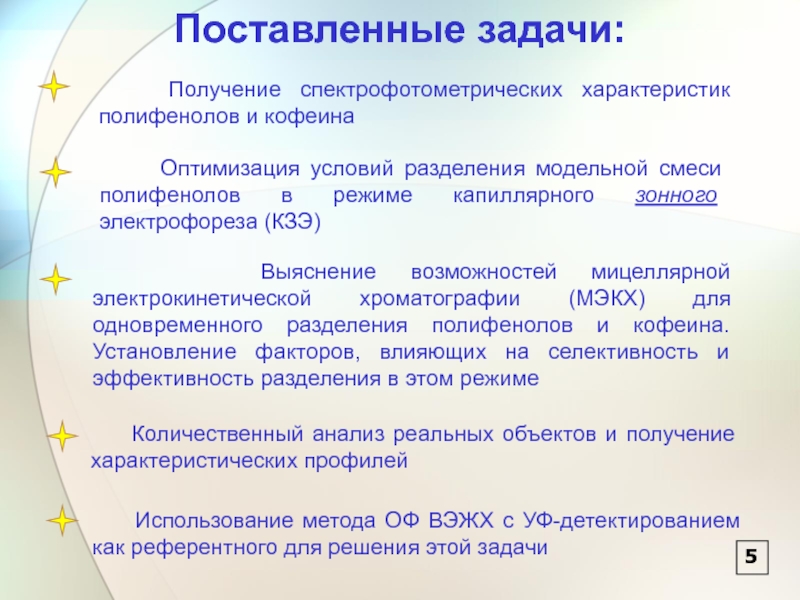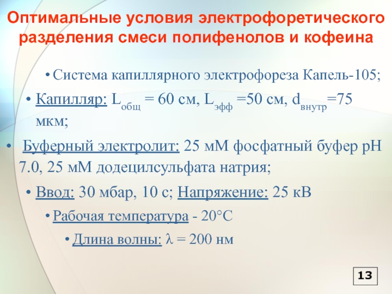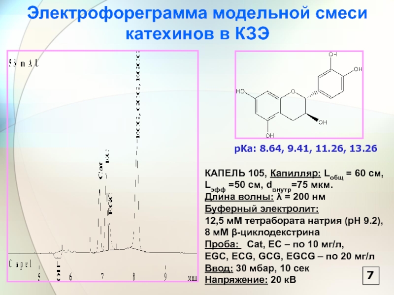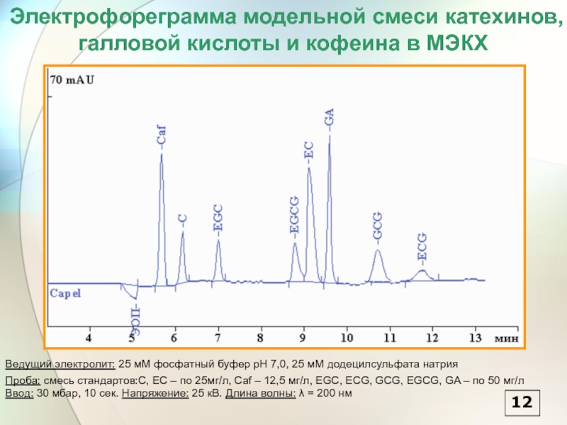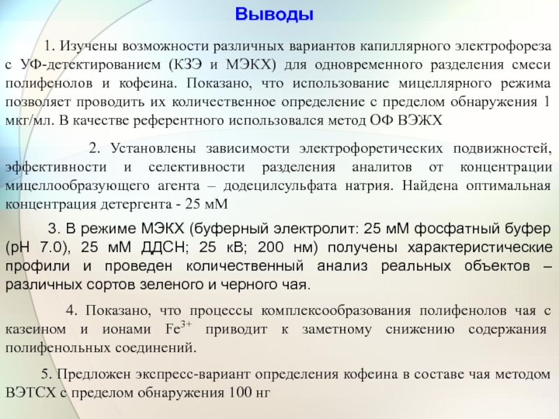 Выяснение возможностей мицеллярной электрокинетической хроматографии (МЭКХ) для одновременного разделения полифенолов и кофеина. Установление факторов, влияющих на селективность и эффективность разделения в этом режиме