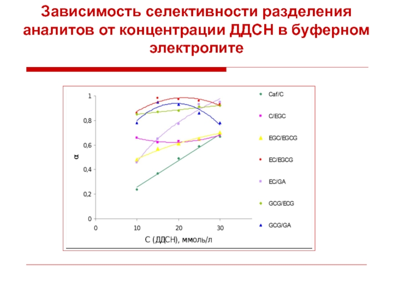 2. Установлены зависимости электрофоретических подвижностей, эффективности и селективности разделения аналитов от концентрации мицеллообразующего агента – додецилсульфата натрия. Найдена оптимальная концентрация детергента - 25 мМ