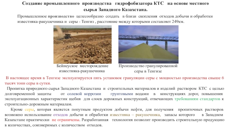 Промышленное производство целесообразно создать в близи скопления отходов добычи и обработки известняка-ракушечника и серы - Тенгиз , расстояние между которыми составляет 249км.