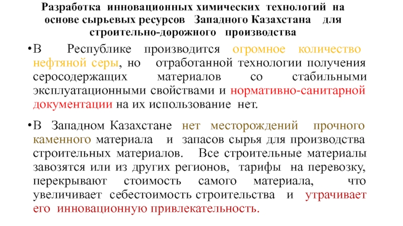 В Западном Казахстане нет месторождений прочного каменного материала и запасов сырья для производства строительных материалов. Все строительные материалы завозятся или из других регионов, тарифы на перевозку, перекрывают стоимость самого материала, что увеличивает себестоимость строительства и утрачивает его инновационную привлекательность.