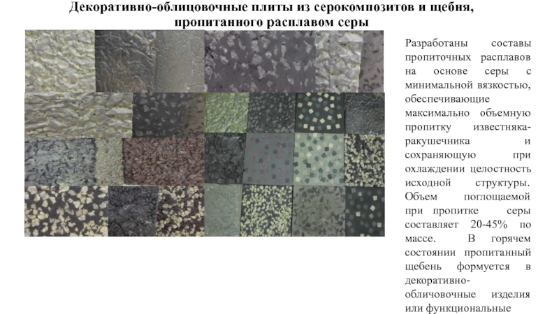 Декоративно-облицовочные плиты из серокомпозитов и щебня, пропитанного расплавом серы