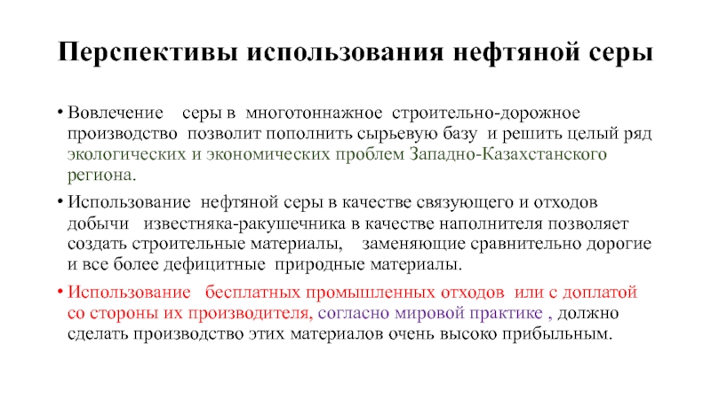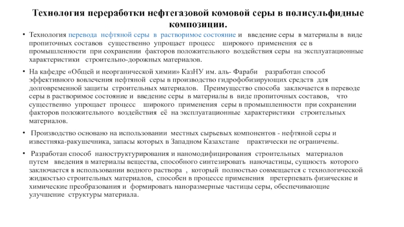В Республике производится огромное количество нефтяной серы, но отработанной технологии получения серосодержащих материалов со стабильными эксплуатационными свойствами и нормативно-санитарной документации на их использование нет.
