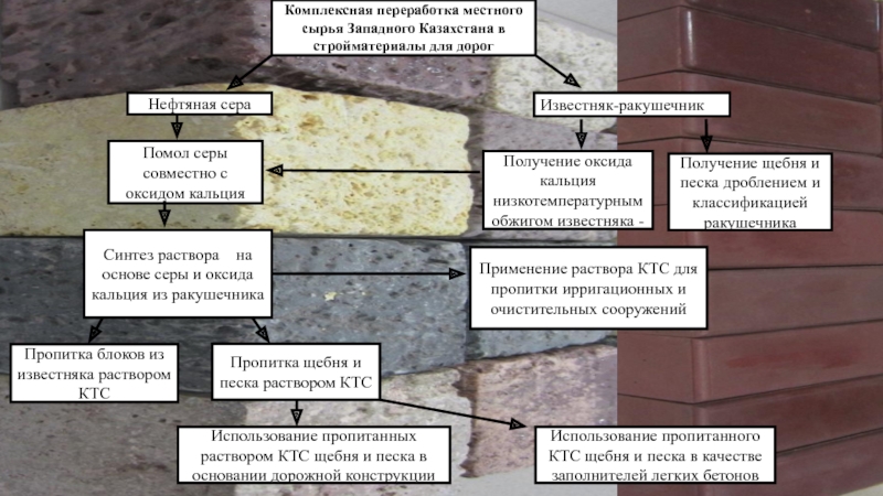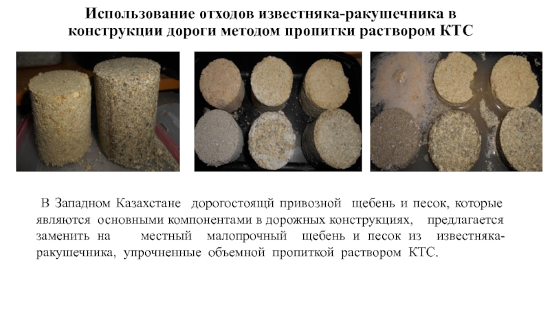 Пропитка природного сырья Западного Казахстана и строительных материалов и изделий раствором КТС с целью долговременной защиты от солевой коррозии грунтовыми водами в конструкциях дорог, повышения эксплуатационных характеристик щебня для слоев дорожных конструкций, отвечающих требованиям стандартов к строительно-дорожным материалам.