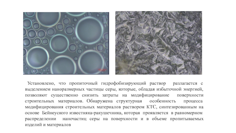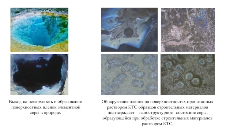 Обнаружение пленок на поверхностностях пропитанных раствором КТС образцов строительных материалов подтверждает наноструктурное состояние серы, образующейся при обработке строительных материалов раствором КТС.