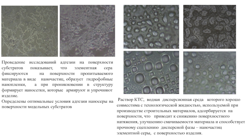 Раствор КТС, водная дисперсионная среда которого хорошо совместима с технологической жидкостью, используемой при производстве строительных материалов, адсорбируется на поверхности, что приводит к снижению поверхностного натяжения, улучшению смачиваемости материала и способствует прочному сцеплению дисперсной фазы – наночастиц элементной серы, с поверхностью изделия.