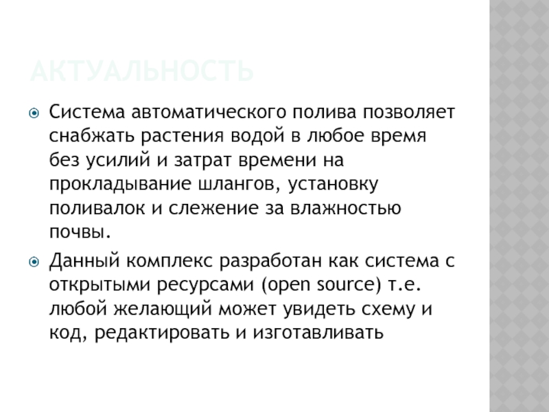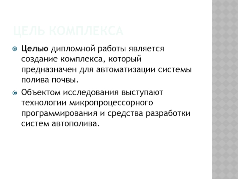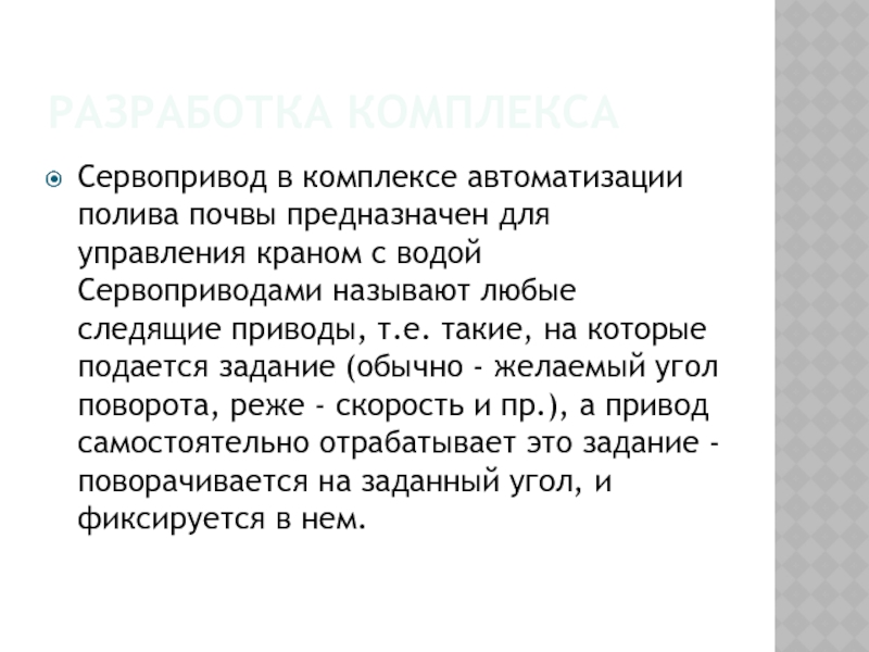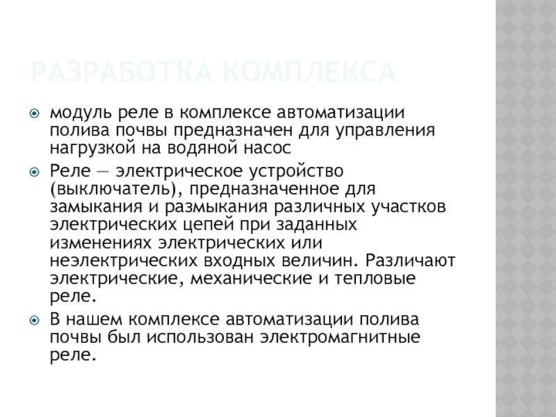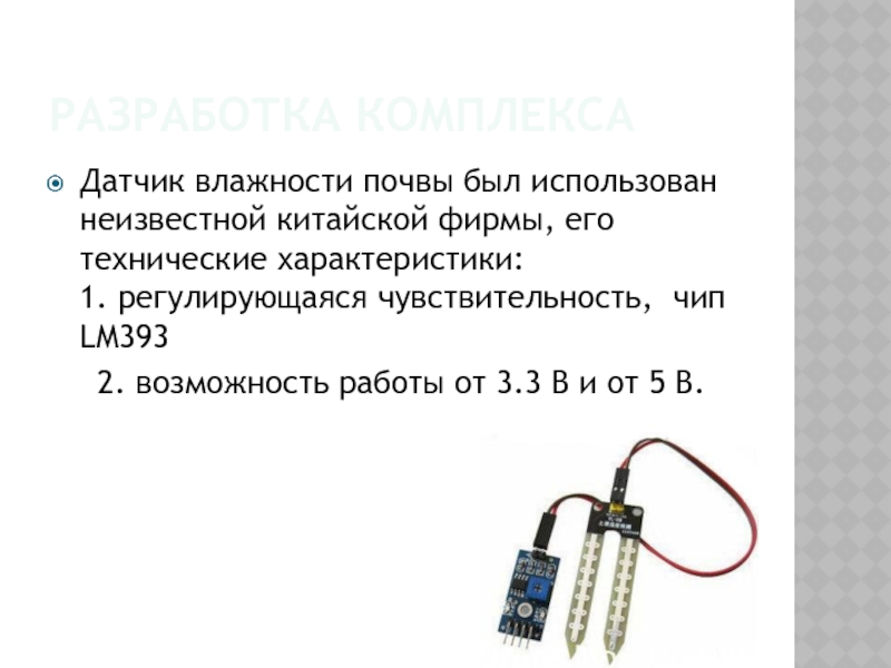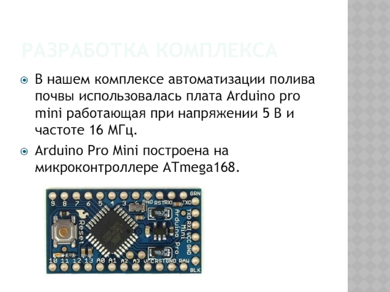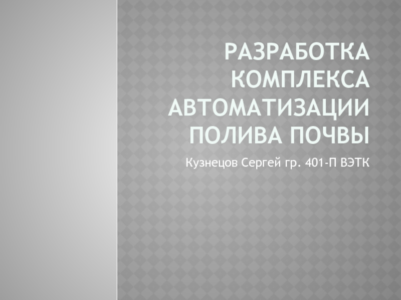 Слайд 1РАЗРАБОТКА КОМПЛЕКСА АВТОМАТИЗАЦИИ ПОЛИВА ПОЧВЫ