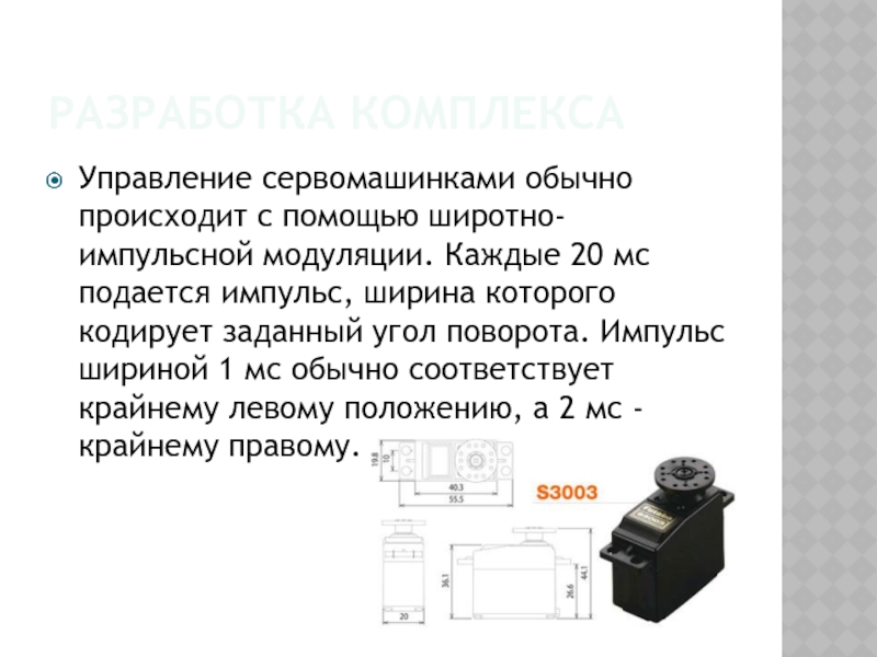 мс подается импульс, ширина которого кодирует заданный угол поворота. Импульс шириной 1 мс обычно соответствует крайнему левому положению, а 2 мс - крайнему правому.