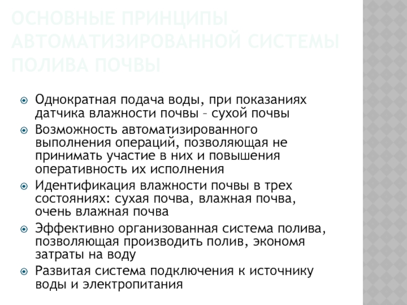 Слайд 17ОСНОВНЫЕ ПРИНЦИПЫ АВТОМАТИЗИРОВАННОЙ СИСТЕМЫ ПОЛИВА ПОЧВЫ