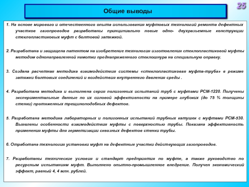 проведение лабораторных, полигонных и натурных испытаний стеклопластиковых муфт различных конструкций с целью оценки эффективности их применения;